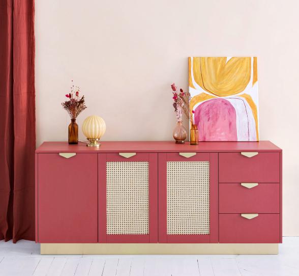 Sie sind sich nicht sicher, ob Rot im Komplett-Look zu viel des Guten ist? Kombinieren Sie es einfach! Die Innenarchitektin beruhigte das Temperament unseres “Terra”, indem sie es mit einer Arbeitsplatte aus Terrazzo, Fronten in “Beige rosé” und Messingdetails kombiniert. Eine effektive Idee, um die Oberschränke optisch zu entlasten und gleichzeitig das Auge auf den Fliesenspiegel zu lenken. Besondere Erwähnung verdient die Sockelleiste aus Messing, die dieses farbenfrohe Arrangement perfekt abrundet.