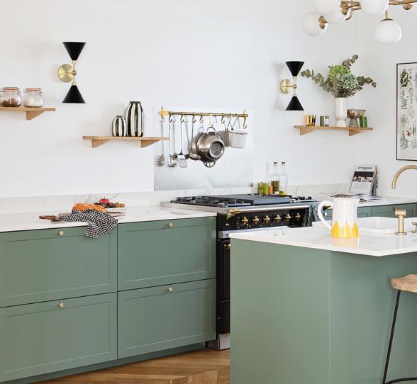 Avec leurs pieds en bois repeint dans la même teinte que nos façades, les buffets composés de caissons Metod deviennent des dessertes colorées qui trouvent leur place dans chaque kitchenette ! Regardez de plus près : les portes à cadre permettent d'apporter du relief aux agencements et de leur donner une allure shaker qui se fond parfaitement dans ce lieu pensé comme une maison de campagne.