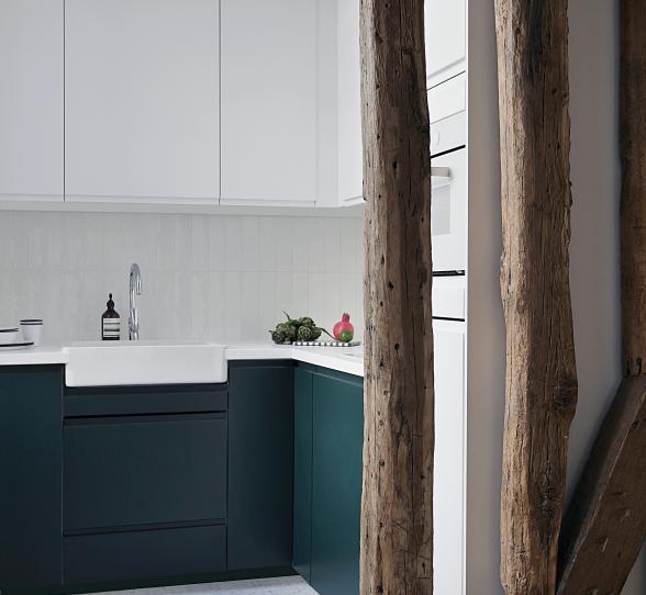 Si Nicolas a réussi à conjuguer plafond bas et cuisine de haute voltige, celle-ci tient plus du bel objet déco que de la pièce purement utilitaire. Le secret tient dans quelques détails savamment choisis, dont l’utilisation de nos façades U-Shape. Sans poignées apparentes, elles dessinent instantanément des décors minimalistes, tout en facilitant la circulation dans l’espace. Une simple étagère flottante en noyer et un mitigeur en laiton finissent de peaufiner l’ensemble. Le juste équilibre.