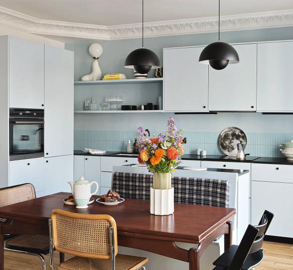 Une pièce, deux ambiances. Côté cuisine, Lisa a misé sur le bleu pour définir les espaces, du mur aux façades. “Je voulais une cuisine bleu ciel, qui a un côté années 50 que j’aime beaucoup, mais sans tomber dans le côté trop pastel ou trop layette.” Du mitigeur au plan de travail en pierre naturelle en passant par les plinthes et les poignées, elle a misé sur des accessoires noirs pour souligner son agencement et donner du caractère aux façades en laque mate lisse Ciel voilé signées Plum Living. “C’est un combo que je fais souvent dans mes dessins pour les vêtements, donc je savais que ça allait bien fonctionner”.