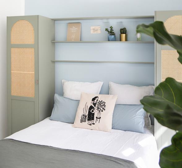 Trop petite, trop grande, pas les bons pieds… Qui n’a pas passé des heures à chercher - sans jamais trouver - la table de chevet de ses rêves ? Plutôt que de scroller jusqu’au bout de la nuit, sortez la visseuse, on a l’inspiration qu’il vous faut ! En suivant ce projet imaginé par Sabine Mérillon, il suffira d’un caisson mural Method et d’un mix de façades en cannage et en chêne peint Bleu lagon pour créer un petit meuble inattendu, à suspendre de part et d’autre du lit. Résultat : un encombrement minimum, pour un style aussi contemporain que poétique.