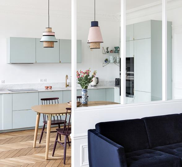 Vous redoutez son côté layette ? Vous craignez sa teinte un peu trop pastel ? Faites confiance à Lisa Gachet pour donner du relief à notre Ciel Voilé. En étirant cette teinte bleu ciel des murs aux façades des meubles, la créatrice a dessiné les contours de sa cuisine ouverte sur le salon. Un monochrome qu’elle a souligné de multiples détails noirs, pour rehausser son allure rétro. Une plinthe contrastante, notre mitigeur Loop noir mat et quelques Mini-Rond noir mat ont suffi pour que la magie opère. Inspirant et inspiré !