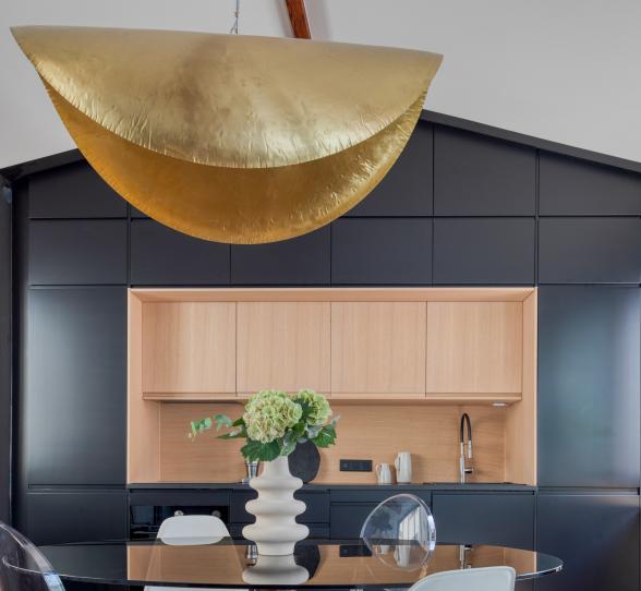 Le comble d’une cuisine tableau toute hauteur ? Se nicher sur un mur en sous-pente. Qu’à cela ne tienne, nos façades peuvent se découper et s’adapter pour créer un agencement quasi sur-mesure. L’idée n’a pas échappé à Jérémie Ocells. L’architecte d’intérieur a mis à profit le talent de son entrepreneur pour imaginer cet aménagement qui épouse la structure des lieux. Nos façades U-Shape à poignées intégrées permettent de renforcer l’effet architectural. Franc et assumé, notre Asphalte habille la structure principale, tandis que nos panneaux de finitions et façades en chêne donnent du rythme à cet écrin noir, tout en créant une niche de rangements supplémentaires. Grandiose !