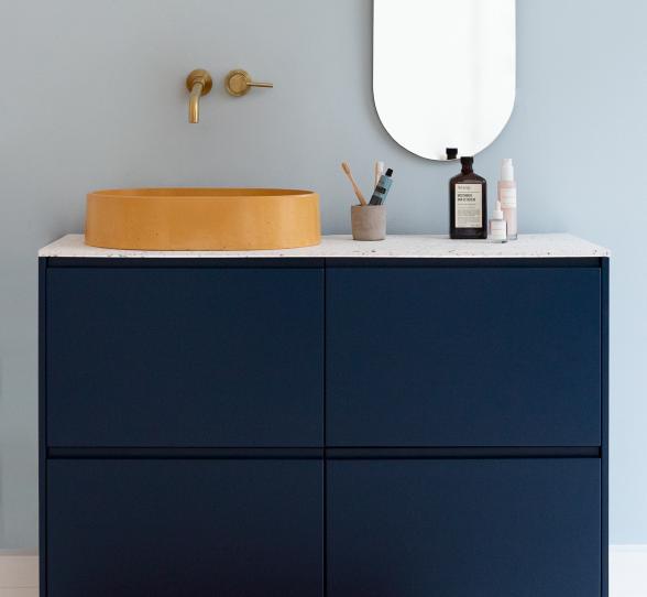 Découvrez comment recréer chez vous ce meuble de salle de bain imaginé par Sabine Mérillon avec nos façades en laque mate U-Shape Bleu nuit, associées avec une vasque en béton ciré signée The French Vikings et un plan de travail en plastique recyclé Le Pavé.