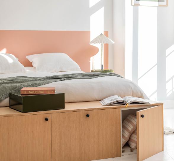 Tour à tour banquette, petits rangements ultra-pratiques et table basse, le bout de lit permet d’habiller la chambre en multipliant les usages ! On y range aussi bien ses coussins que ses chaussures, à moins qu’on ne préfère y disposer ses plus beaux livres. Peu importe : le principe reste le même, comme vous pouvez le découvrir dans ce Step by Step réalisé au Studio Plum Living.